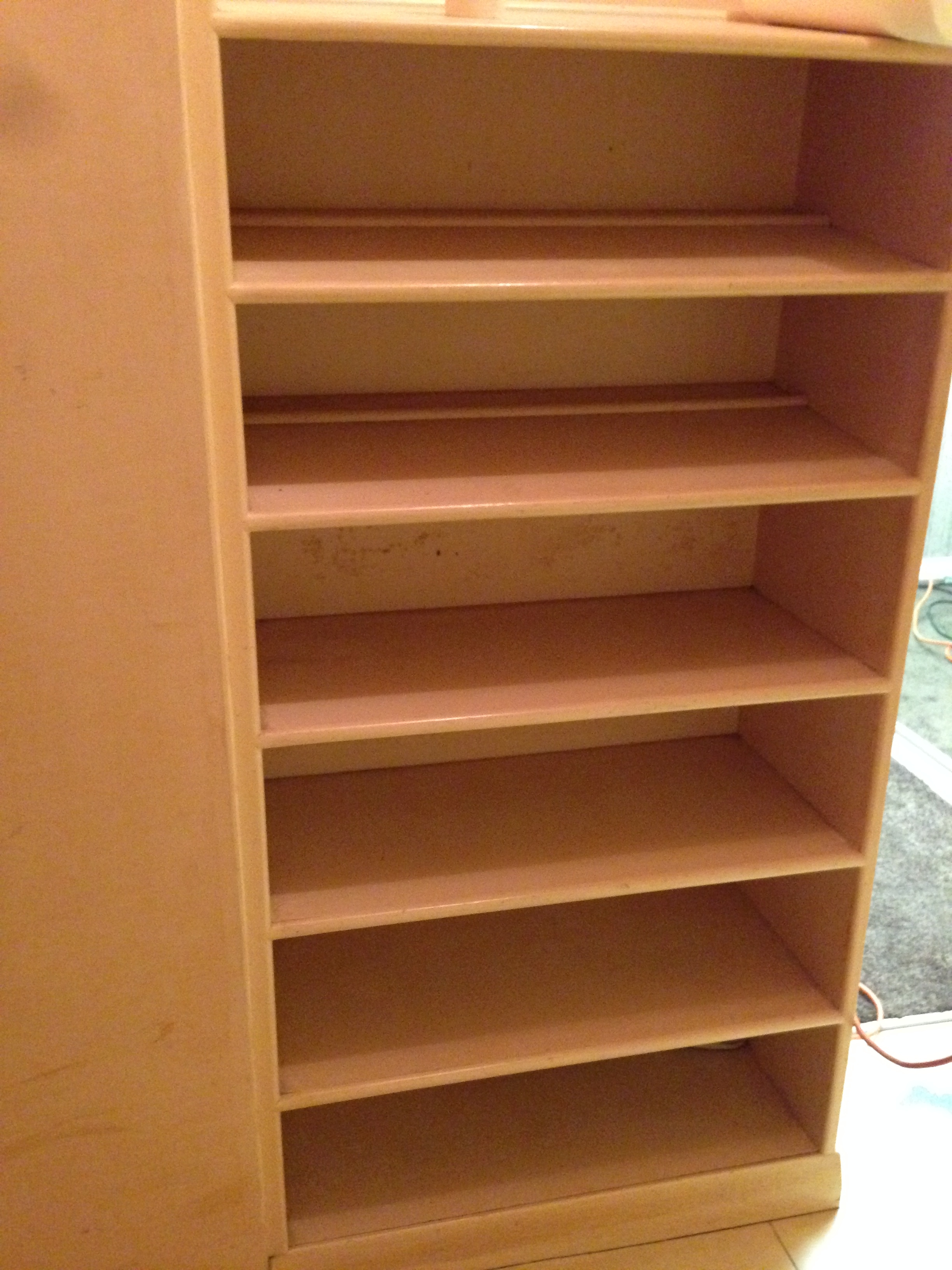 Given the nicotine damage, we were going to have to prime every inch of the inside of the closet and start with a blank slate — the walls are a bit textured (probably paint over textured wallpaper), and so scrubbing the brown stains out was going to be near impossible.  So for the colors, I figured we’d match the walls to the cream linoleum floor…  And for the trim, I decided to play off of those navy glitter butterflies in the linoleum, and do all of the shelves and trim in navy metallic paint.