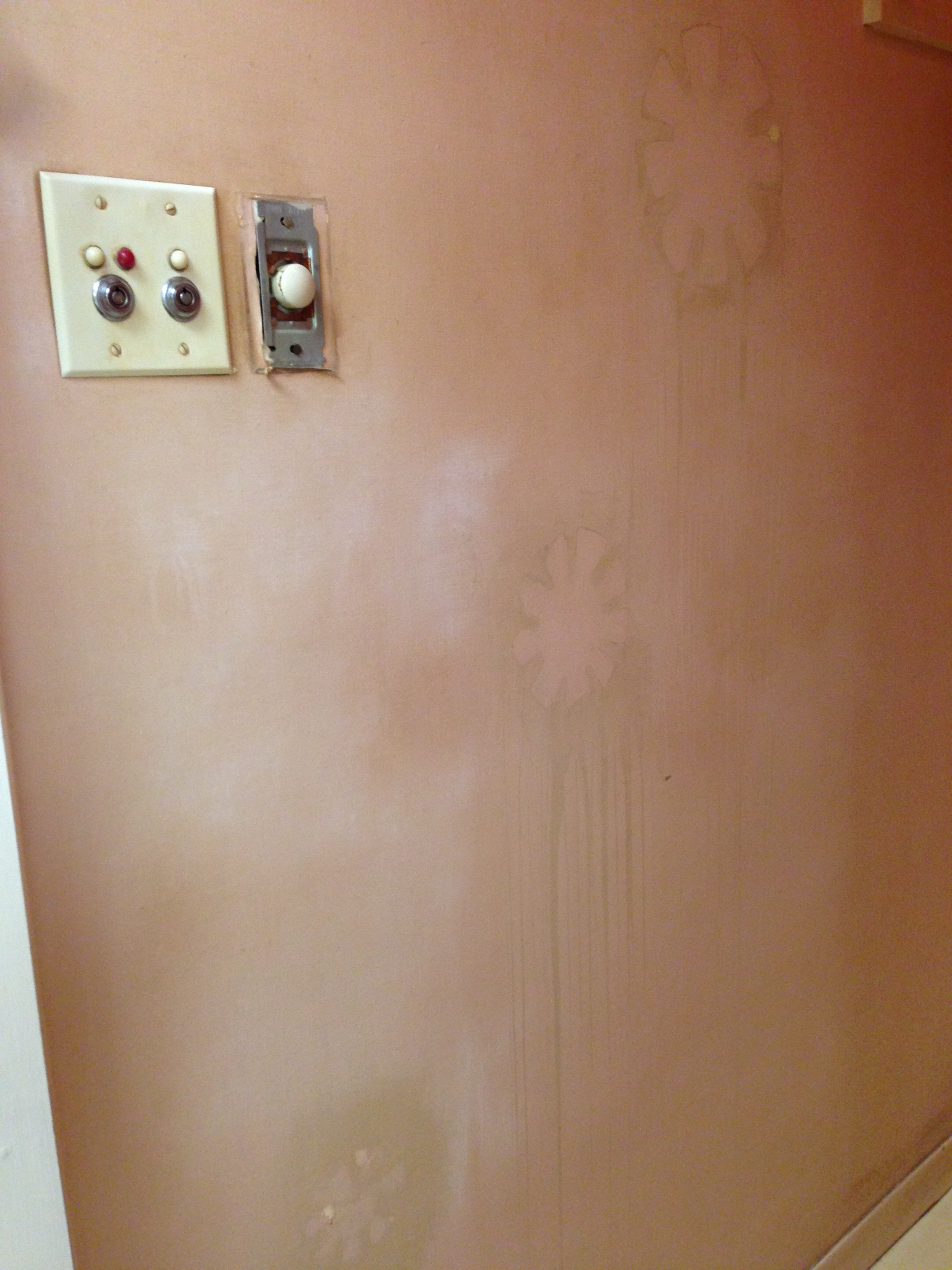It had originally been painted pale pink to go with the pink marble in the vanity area, but years of cigarette smoke left it sort of a dirty mauve.  In this shot, you can see the original vs aged/nicotined shades of pink, where we peeled off some big faded flower stickers.