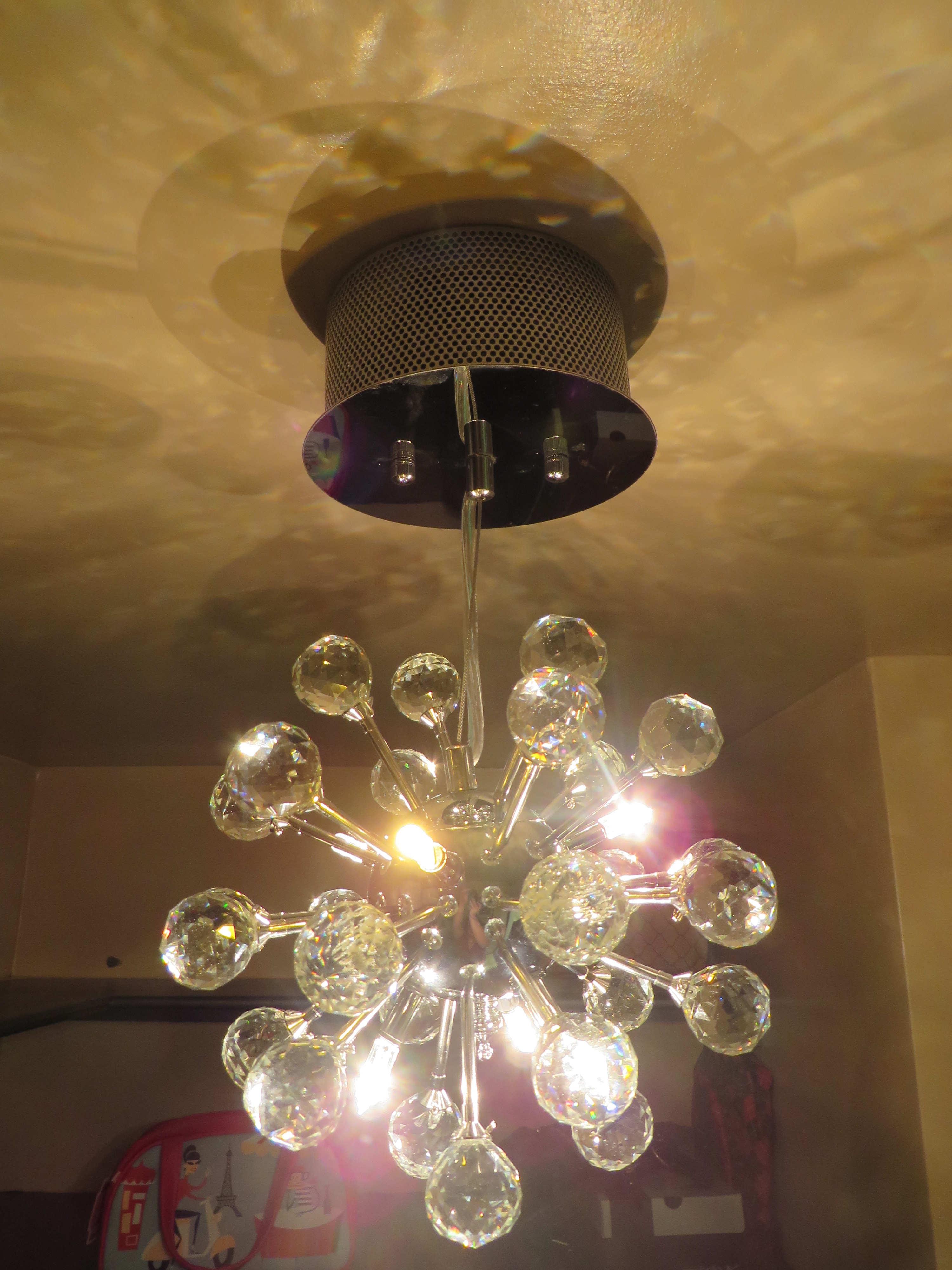 And even though the original light fixture was cool*, I just couldn’t resist swapping it out for something a little girly and glam — a mini crystal sputnik chandelier!