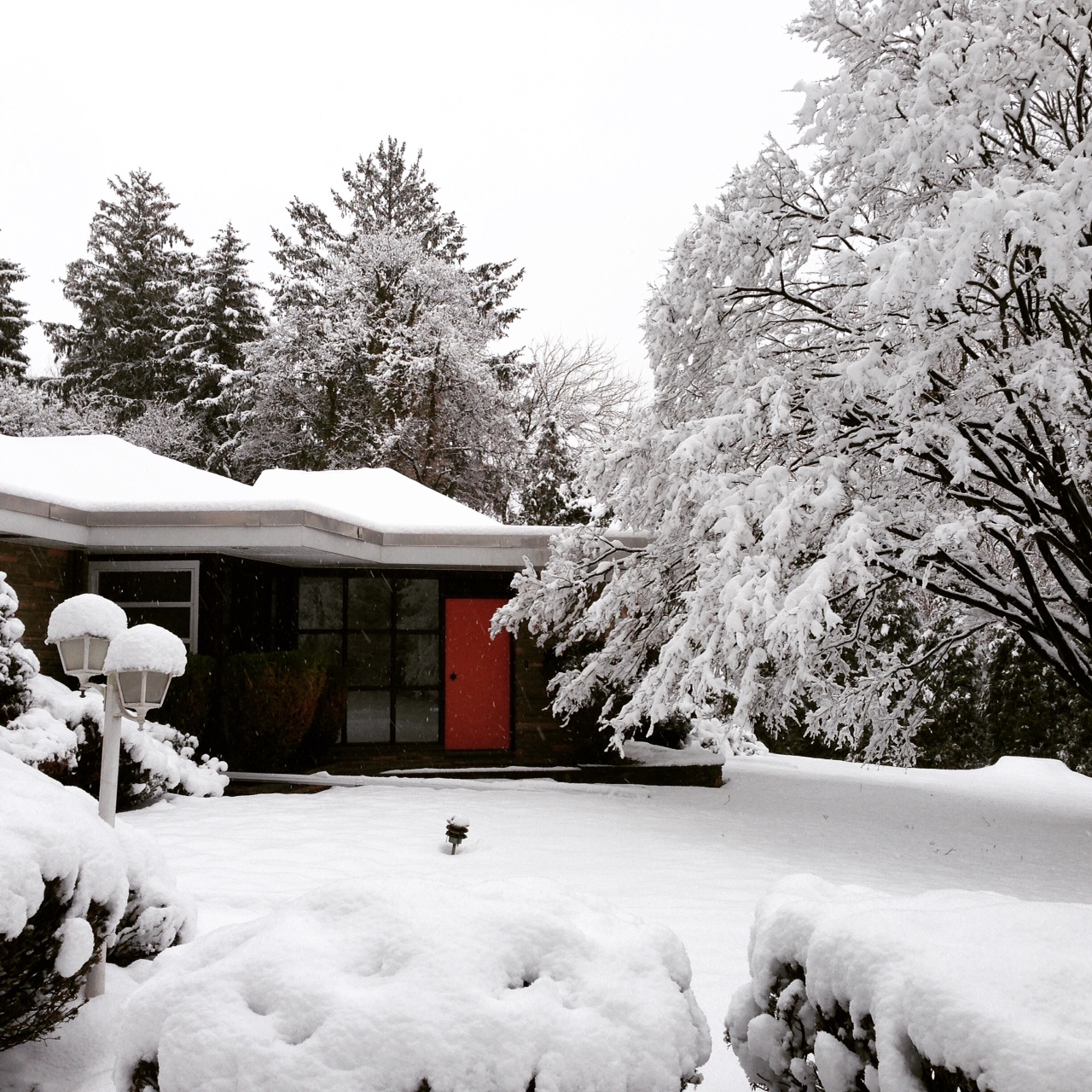 Our orange front door standing out against that sea of white.