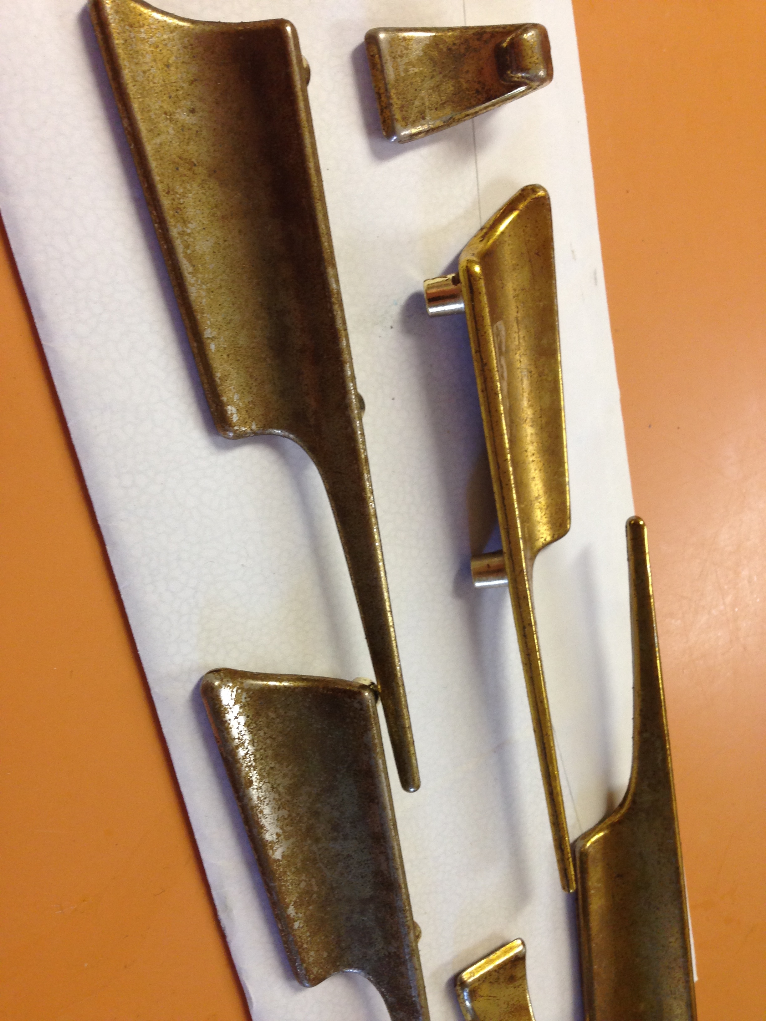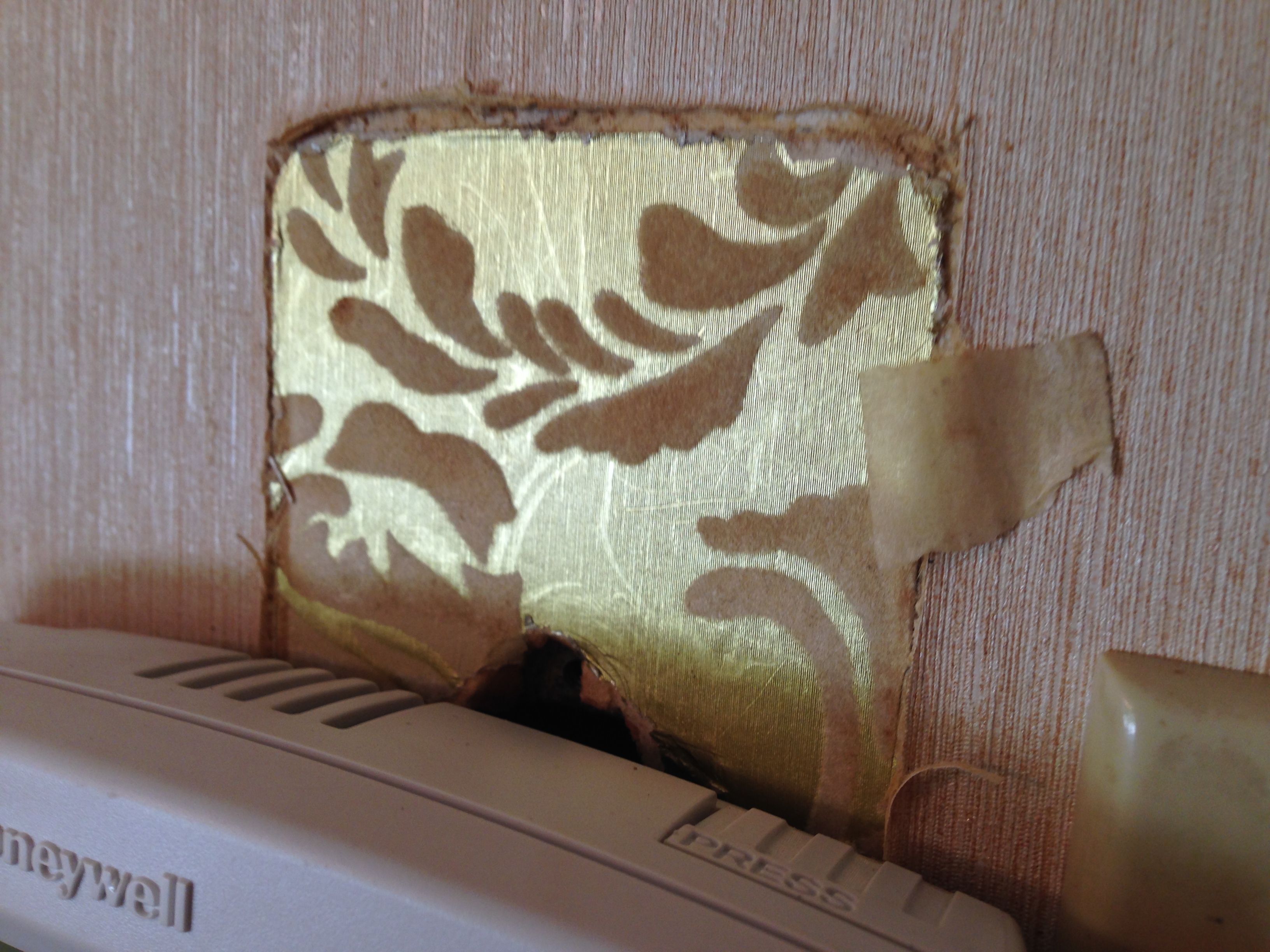 You might recall from a post a few months ago, that we decided to go with a metallic wallpaper for the walls. When we were fixing the wall with the water damage, we discovered a little patch of the original wallpaper under the thermostat… and given that it was a wacky gold metallic flocked pattern, we wanted to make a nod to the original without being *quite* so wacky.