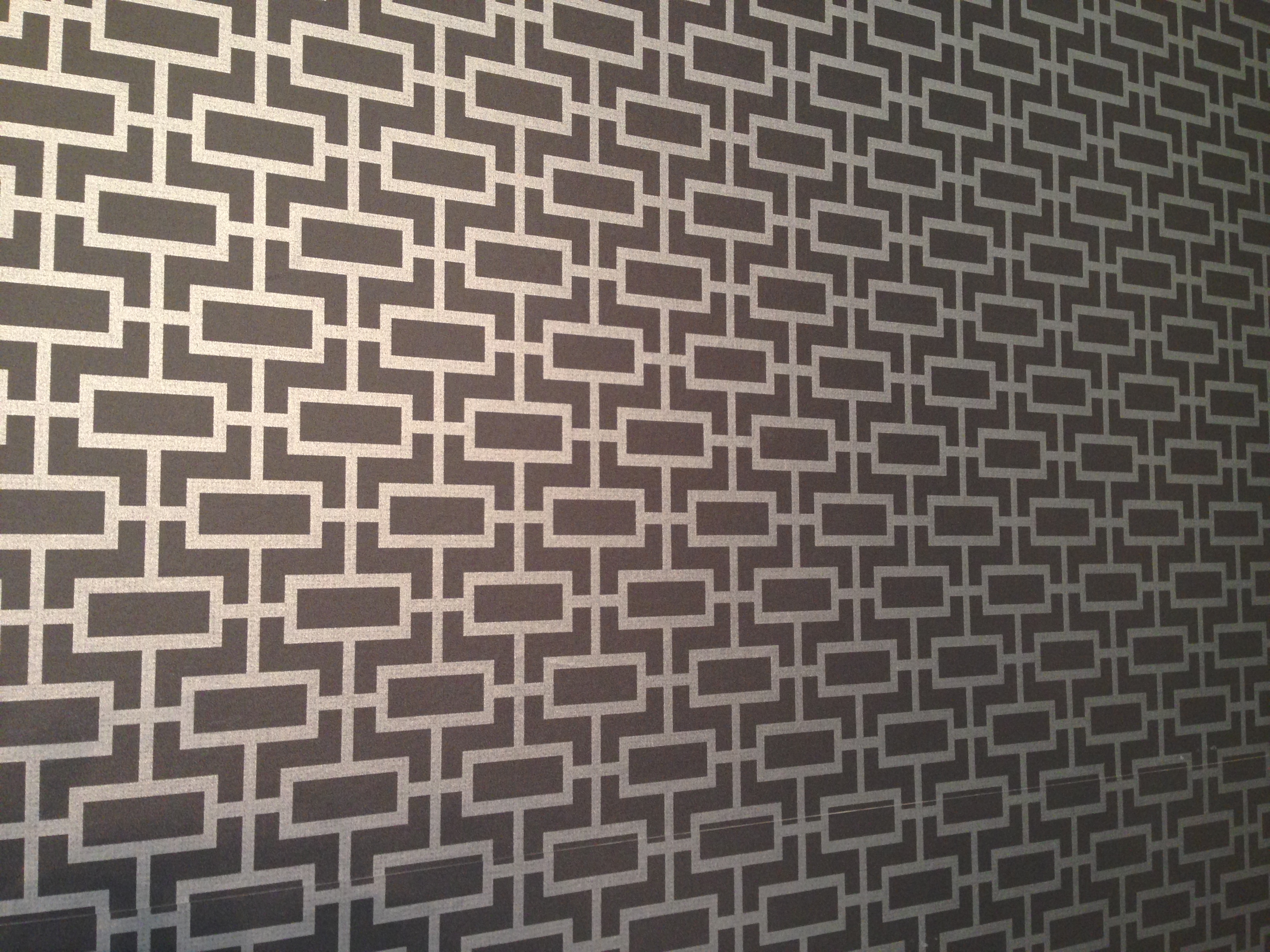 So, we found a lovely gray and pewter pattern that was a bit shiny, but also more modern and elegant. And we had our paper hanger friend put it up sideways, so that the pattern in the paper matched the shoji pattern in some of the woodwork throughout the house.