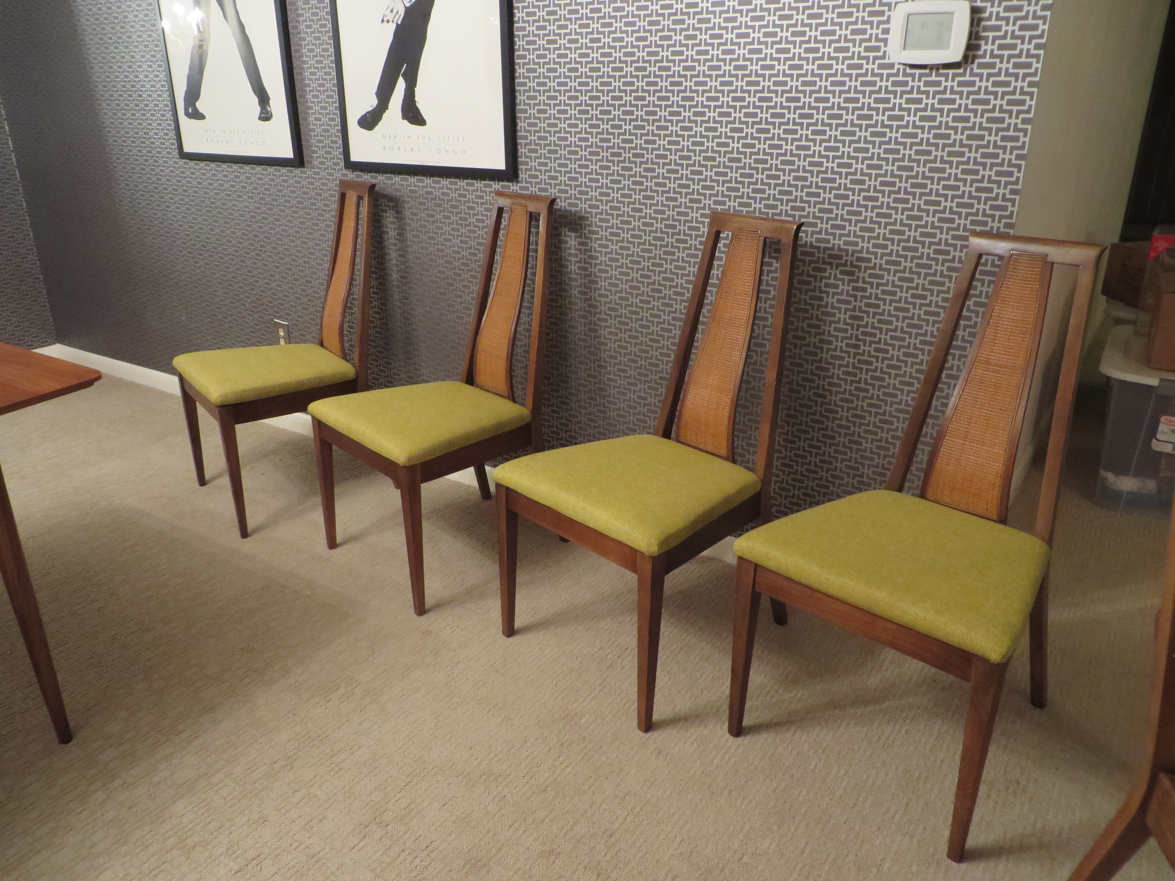 We found the table and chairs set first, so at least we had a place to eat. 😛 And we were so in love with the acid yellow/green fabric on the chairs, because it really stands out against the gray wallpaper.